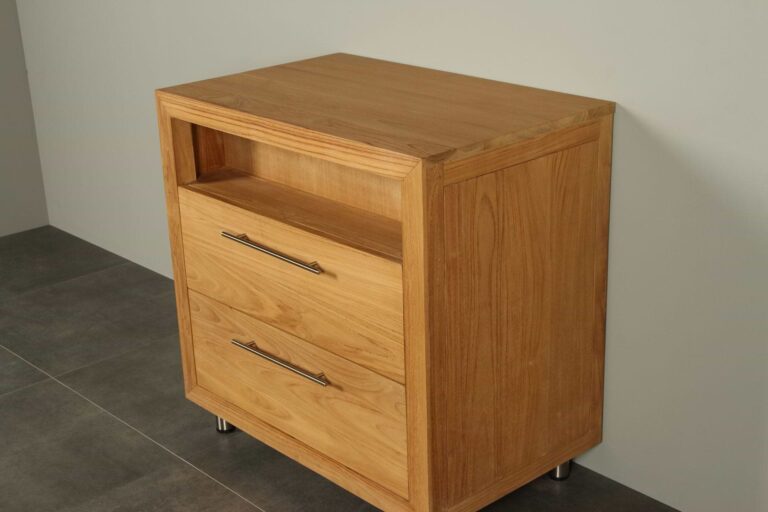 Dit is een mooi strak badkamermeubel wat u in uw badkamer erbij plaatst of gebruikt om er uw wasbak of waskom op te plaatsen. Door de twee grote laden in dit teakhouten badmeubel heeft u altijd genoeg ruimte om uw handdoeken e.d. in op te bergen.
