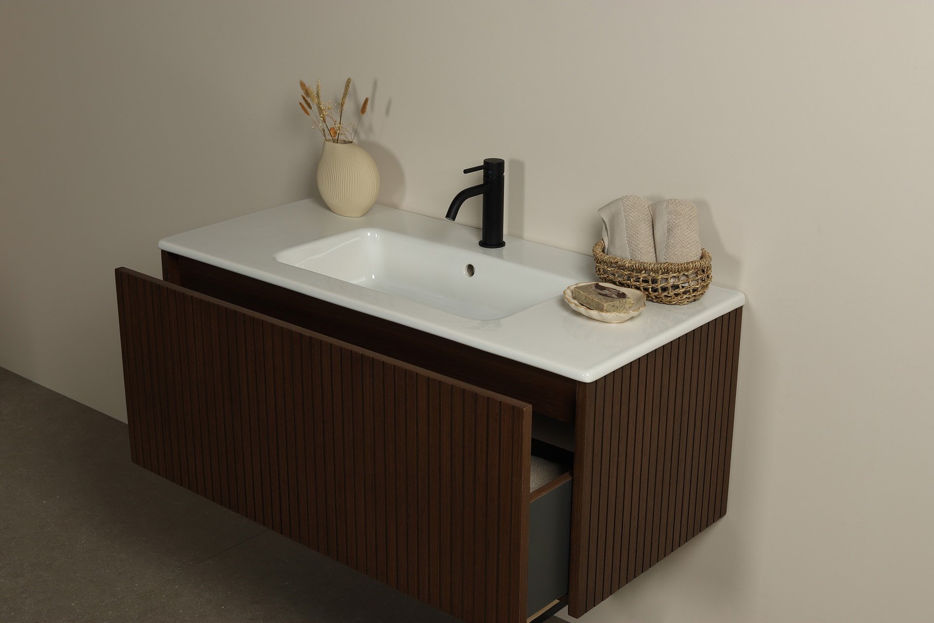 Badkamermeubel Notenhout ribbels Azul 100 cm met Keramische Wastafel