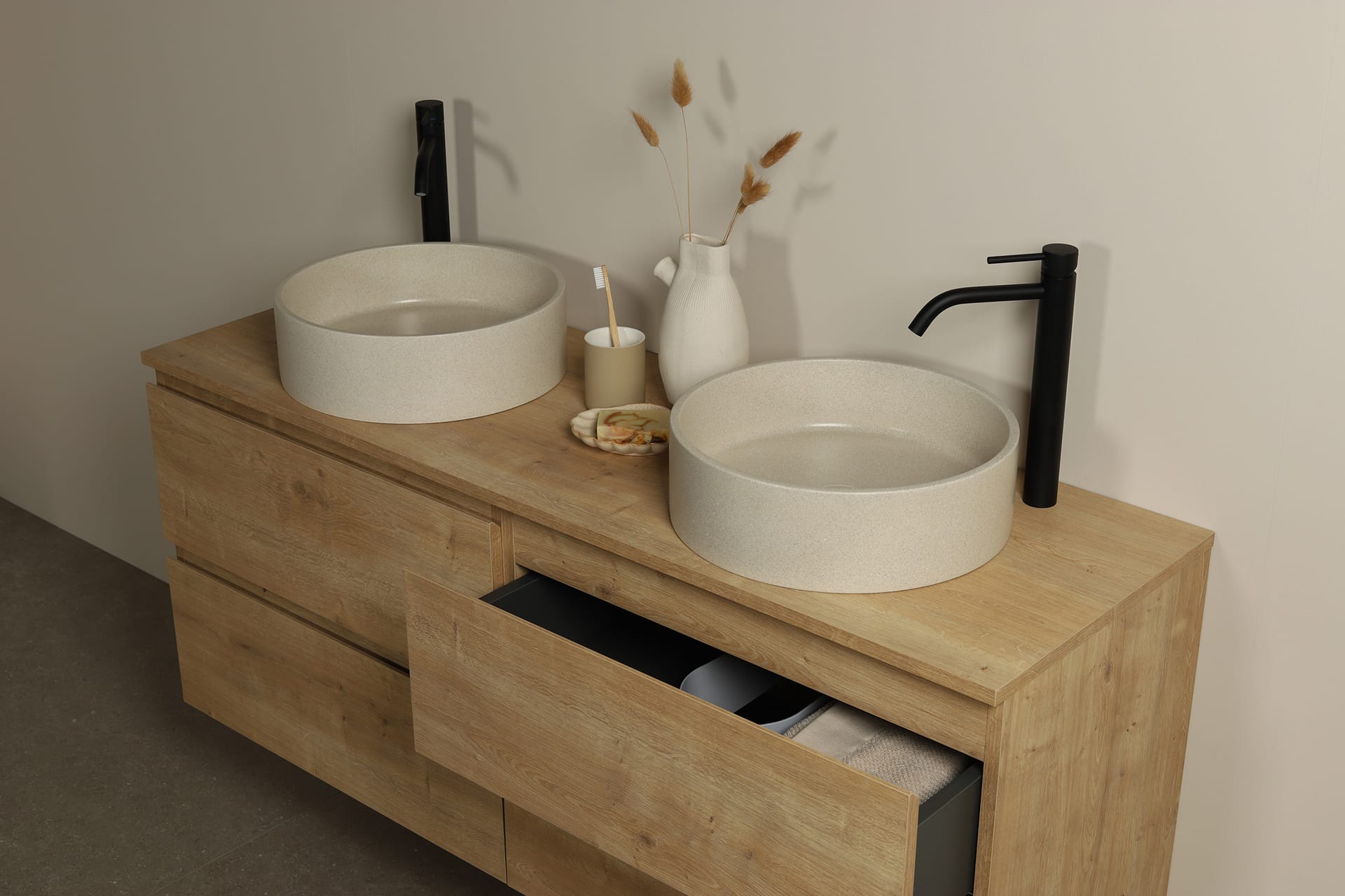 Badkamermeubel uit MDF melamine licht eiken. Dit is een hangend badmeubel wat aan de muur, eventueel ondersteund met hangbeugels, wordt bevestigd. Bezoek onze pagina’s met wasbakken en waskommen om dit badkamermeubel helemaal compleet te maken.