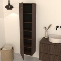 De Manaro hoge badkamerkast in donker eiken is de perfecte aanvulling op jouw badkamermeubel. Dankzij het slanke, hoge ontwerp en de praktische indeling met vijf legplanken biedt deze kast volop opbergruimte voor handdoeken, toiletartikelen en andere badkamerbenodigdheden. De kast combineert moeiteloos met de Kawi en Nila serie en geeft je badkamer een warme, luxe uitstraling.