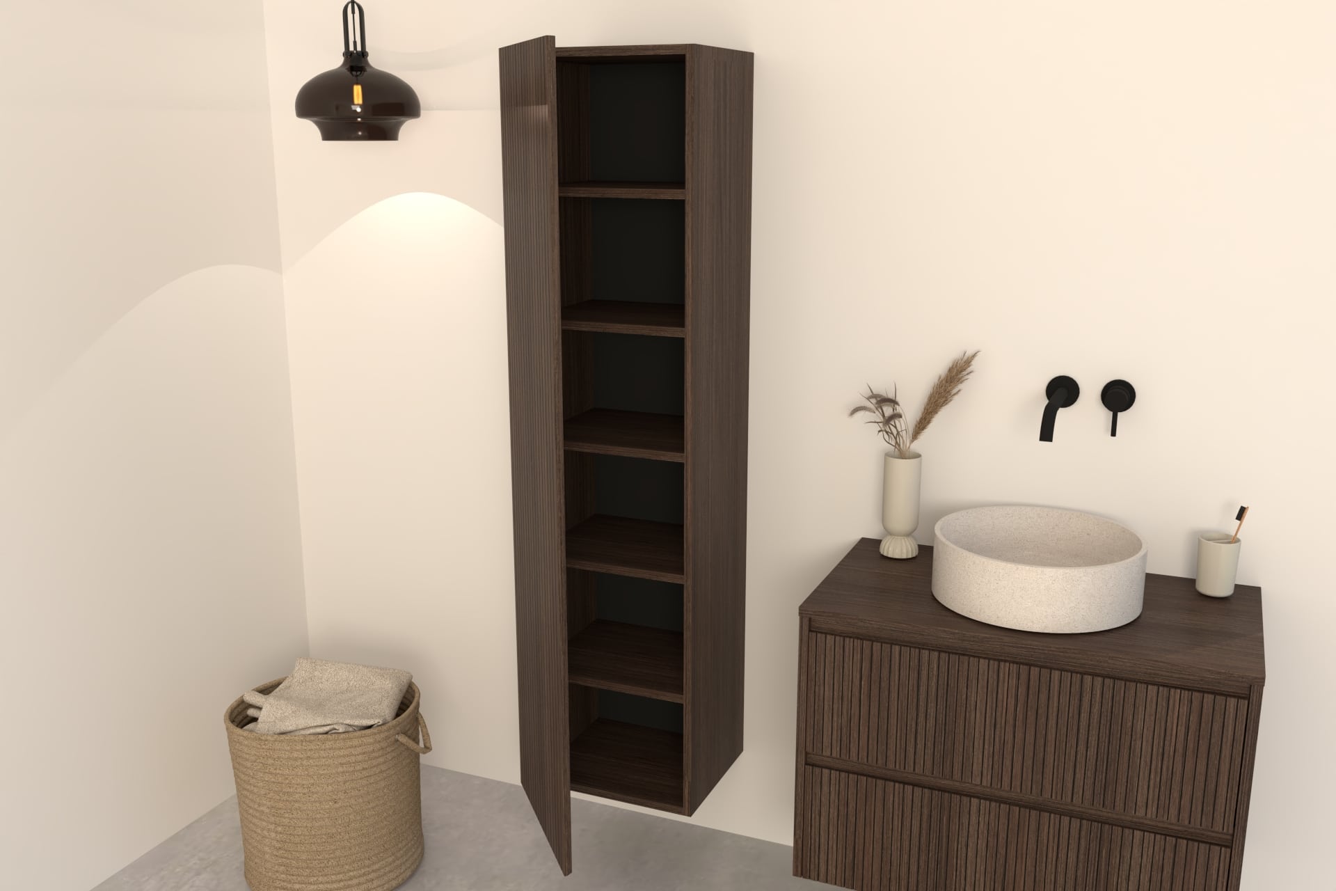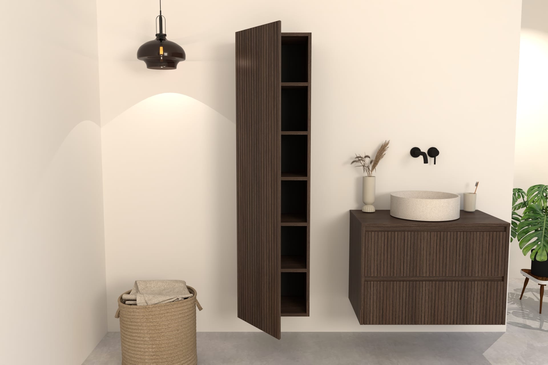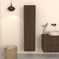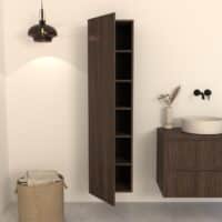 Combineer de Manaro hoge badkamerkast met een bijpassend Kawi of Nila  badkamermeubel in dezelfde warme donker eikenkleur.