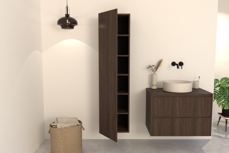 Hoge Badkamerkast donker eiken Manaro 160 cm – Ribbelfront Deuren Softclose