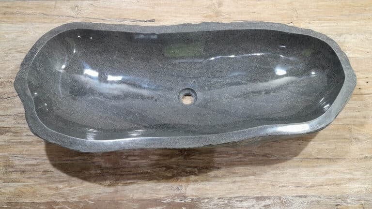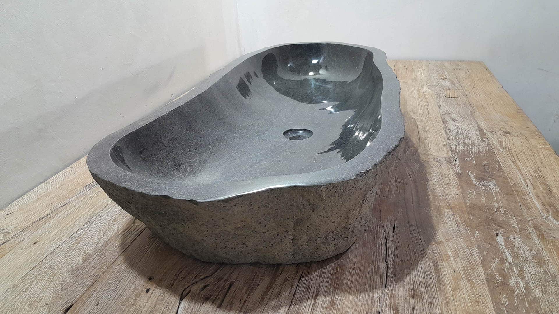 Deze grote rivierstenen waskom van is ideaal voor ruime badkamermeubels, zowel voor grote eenpersoons- als tweepersoons badkamermeubels. De binnenzijde van de riviersteen wasbak wordt glad gepolijst voor een snelle waterafvoer en eenvoudig onderhoud, de buitenzijde blijft ruw en onbewerkt waardoor de kom zijn robuuste en natuurlijke uitstraling behoudt.