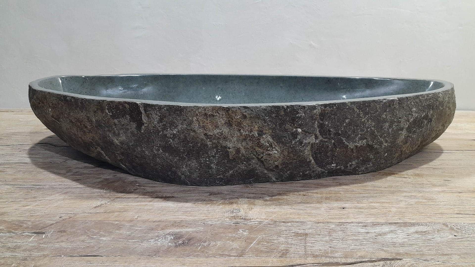 Deze grote rivierstenen waskom van is ideaal voor ruime badkamermeubels, zowel voor grote eenpersoons- als tweepersoons badkamermeubels. De binnenzijde van de riviersteen wasbak wordt glad gepolijst voor een snelle waterafvoer en eenvoudig onderhoud, de buitenzijde blijft ruw en onbewerkt waardoor de kom zijn robuuste en natuurlijke uitstraling behoudt.