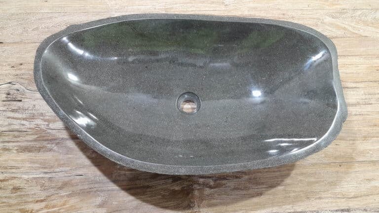 Deze grote rivierstenen waskom van is ideaal voor ruime badkamermeubels, zowel voor grote eenpersoons- als tweepersoons badkamermeubels. De binnenzijde van de riviersteen wasbak wordt glad gepolijst voor een snelle waterafvoer en eenvoudig onderhoud, de buitenzijde blijft ruw en onbewerkt waardoor de kom zijn robuuste en natuurlijke uitstraling behoudt.