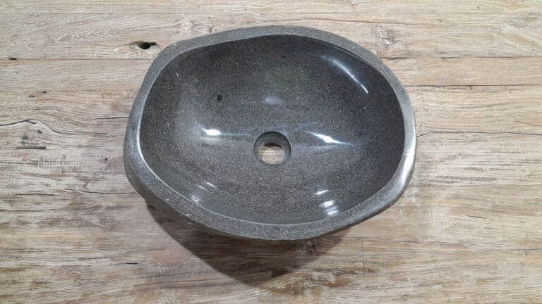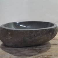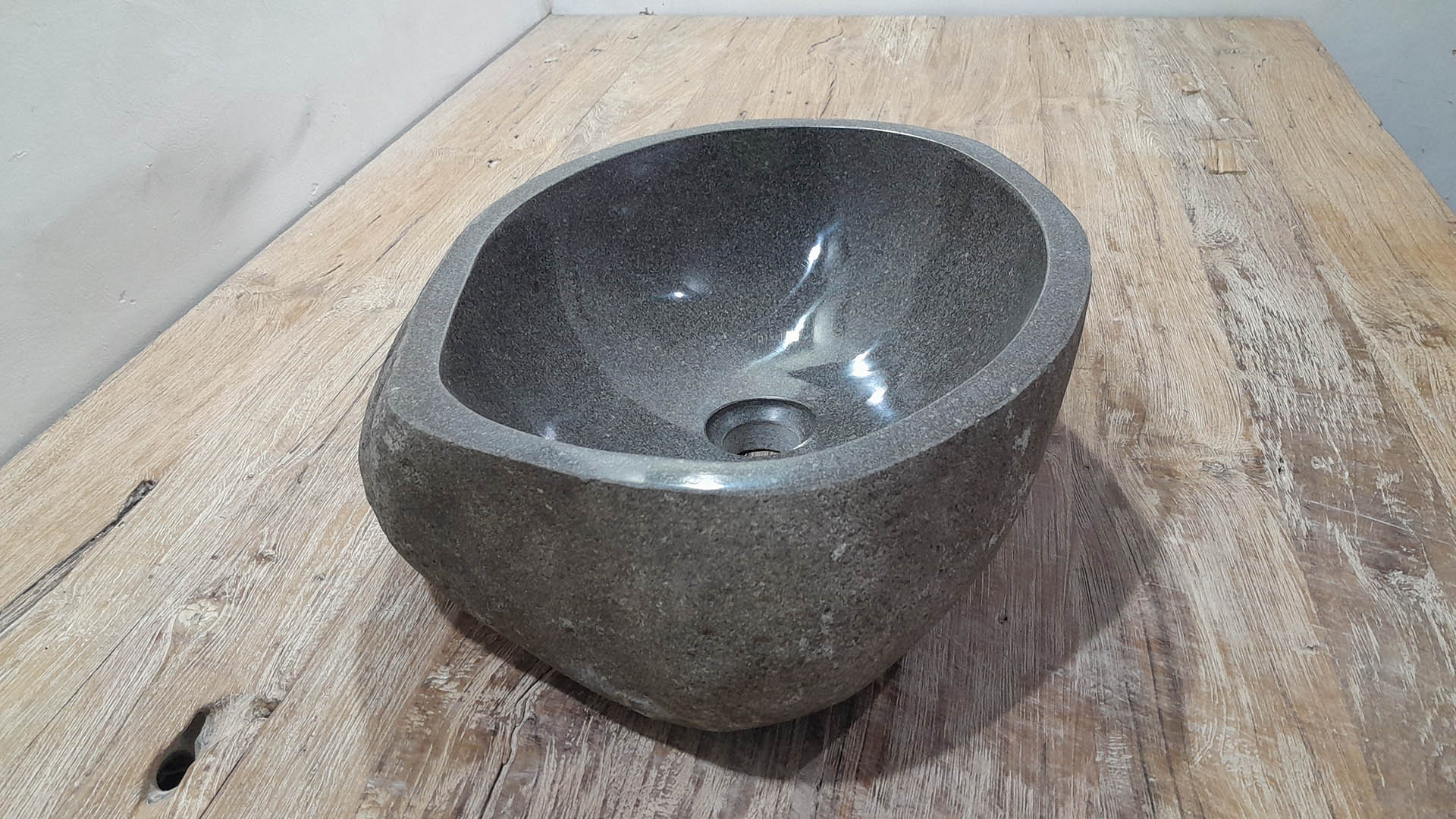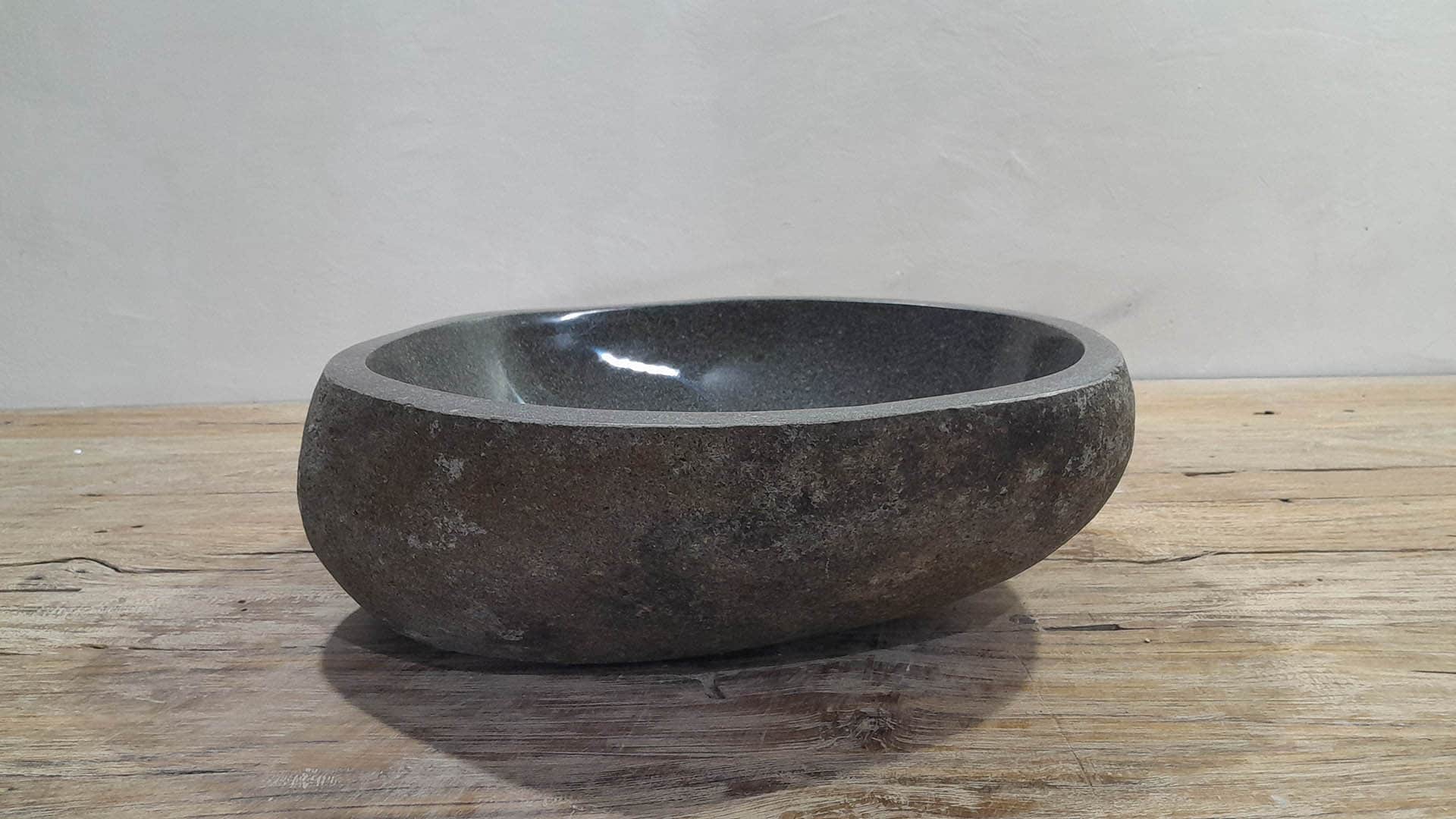 Middelgrote natuursteen waskom van Riviersteen. Deze rivierstenen waskom van is perfect voor kleine tot middelgrote badkamermeubels. Elke rivierstenen waskom wordt met de hand vervaardigd uit massief natuursteen. De binnenzijde van de kom wordt glad gepolijst voor een snelle waterafvoer en eenvoudig onderhoud, de buitenzijde blijft ruw en onbewerkt waardoor de kom zijn robuuste en natuurlijke karakter behoudt.