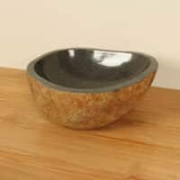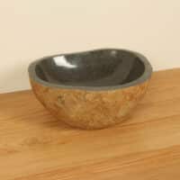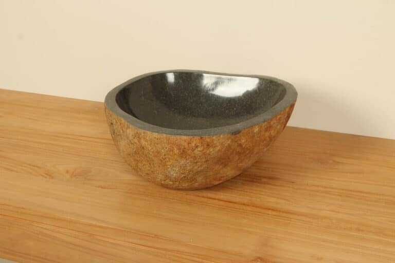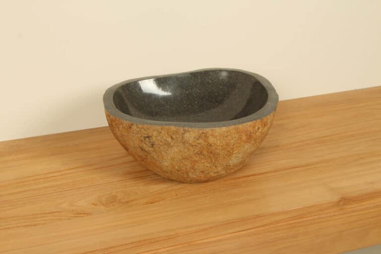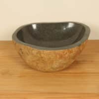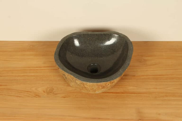 Middelgrote natuursteen waskom van Riviersteen. Deze rivierstenen waskom van is perfect voor kleine tot middelgrote badkamermeubels. Elke rivierstenen waskom wordt met de hand vervaardigd uit massief natuursteen. De binnenzijde van de kom wordt glad gepolijst voor een snelle waterafvoer en eenvoudig onderhoud, de buitenzijde blijft ruw en onbewerkt waardoor de kom zijn robuuste en natuurlijke karakter behoudt.