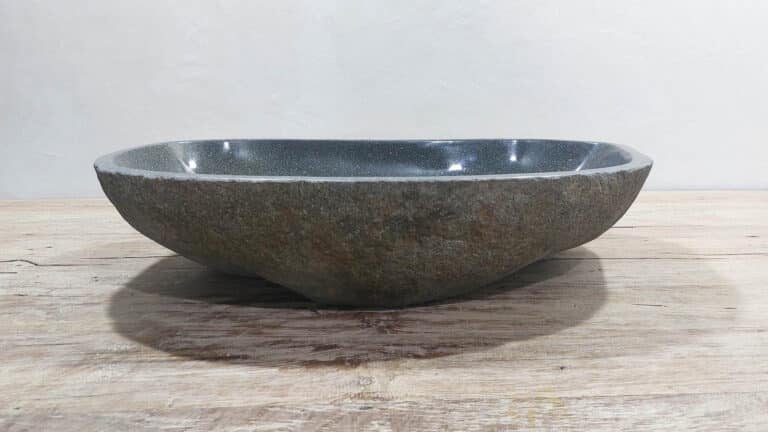 Middelgrote natuursteen waskom van Riviersteen. Deze rivierstenen waskom van is perfect voor kleine tot middelgrote badkamermeubels. Elke rivierstenen waskom wordt met de hand vervaardigd uit massief natuursteen. De binnenzijde van de kom wordt glad gepolijst voor een snelle waterafvoer en eenvoudig onderhoud, de buitenzijde blijft ruw en onbewerkt waardoor de kom zijn robuuste en natuurlijke karakter behoudt.
