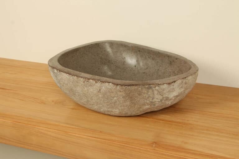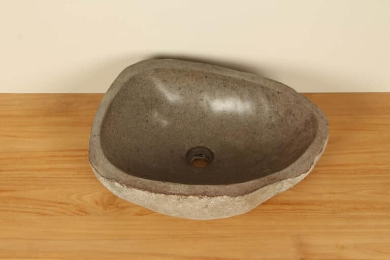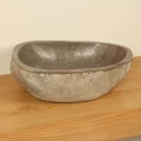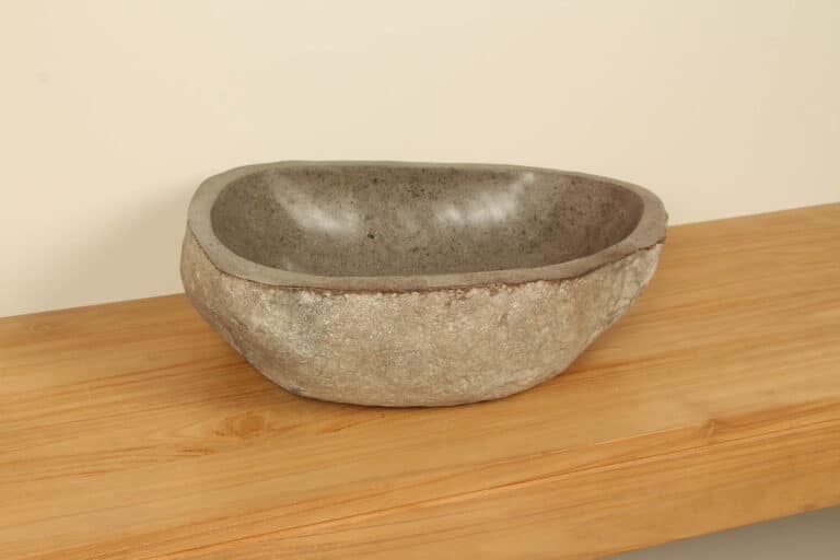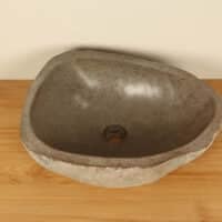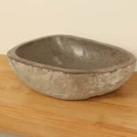 Middelgrote natuursteen waskom van Riviersteen. Deze rivierstenen waskom van is perfect voor kleine tot middelgrote badkamermeubels. Elke rivierstenen waskom wordt met de hand vervaardigd uit massief natuursteen. De binnenzijde van de kom wordt glad gepolijst voor een snelle waterafvoer en eenvoudig onderhoud, de buitenzijde blijft ruw en onbewerkt waardoor de kom zijn robuuste en natuurlijke karakter behoudt.
