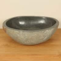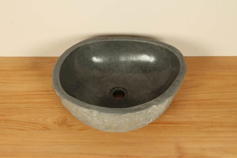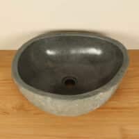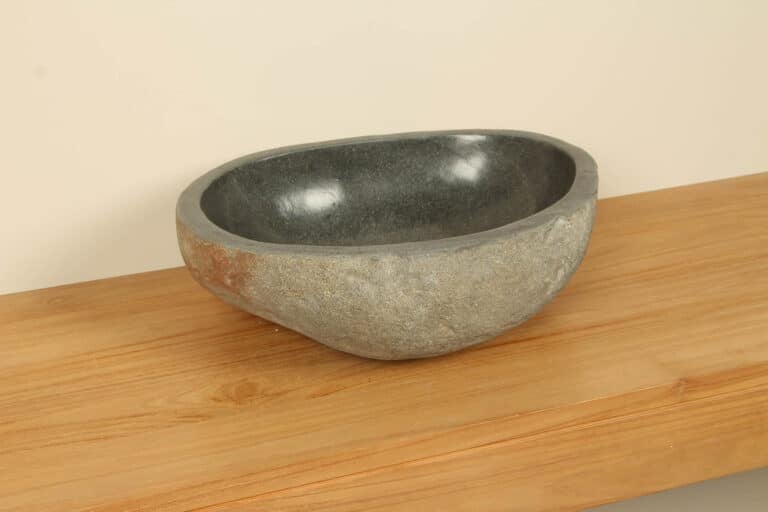 Middelgrote natuursteen waskom van Riviersteen. Deze rivierstenen waskom van is perfect voor kleine tot middelgrote badkamermeubels. Elke rivierstenen waskom wordt met de hand vervaardigd uit massief natuursteen. De binnenzijde van de kom wordt glad gepolijst voor een snelle waterafvoer en eenvoudig onderhoud, de buitenzijde blijft ruw en onbewerkt waardoor de kom zijn robuuste en natuurlijke karakter behoudt.
