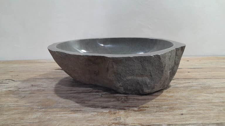 Middelgrote natuursteen waskom van Riviersteen. Deze rivierstenen waskom van is perfect voor kleine tot middelgrote badkamermeubels. Elke rivierstenen waskom wordt met de hand vervaardigd uit massief natuursteen. De binnenzijde van de kom wordt glad gepolijst voor een snelle waterafvoer en eenvoudig onderhoud, de buitenzijde blijft ruw en onbewerkt waardoor de kom zijn robuuste en natuurlijke karakter behoudt.