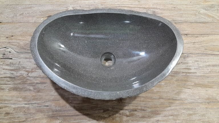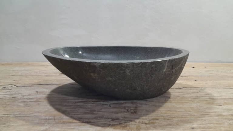 Middelgrote natuursteen waskom van Riviersteen. Deze rivierstenen waskom van is perfect voor kleine tot middelgrote badkamermeubels. Elke rivierstenen waskom wordt met de hand vervaardigd uit massief natuursteen. De binnenzijde van de kom wordt glad gepolijst voor een snelle waterafvoer en eenvoudig onderhoud, de buitenzijde blijft ruw en onbewerkt waardoor de kom zijn robuuste en natuurlijke karakter behoudt.