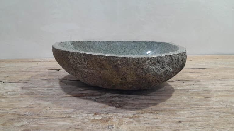 Middelgrote natuursteen waskom van Riviersteen. Deze rivierstenen waskom van is perfect voor kleine tot middelgrote badkamermeubels. Elke rivierstenen waskom wordt met de hand vervaardigd uit massief natuursteen. De binnenzijde van de kom wordt glad gepolijst voor een snelle waterafvoer en eenvoudig onderhoud, de buitenzijde blijft ruw en onbewerkt waardoor de kom zijn robuuste en natuurlijke karakter behoudt.