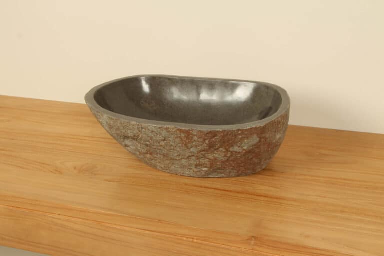 Middelgrote natuursteen waskom van Riviersteen. Deze rivierstenen waskom van is perfect voor kleine tot middelgrote badkamermeubels. Elke rivierstenen waskom wordt met de hand vervaardigd uit massief natuursteen. De binnenzijde van de kom wordt glad gepolijst voor een snelle waterafvoer en eenvoudig onderhoud, de buitenzijde blijft ruw en onbewerkt waardoor de kom zijn robuuste en natuurlijke karakter behoudt.
