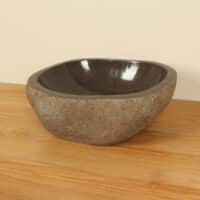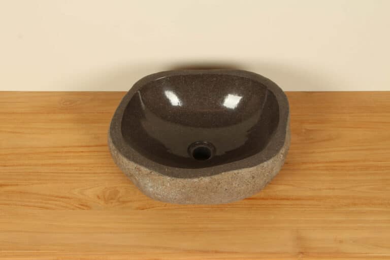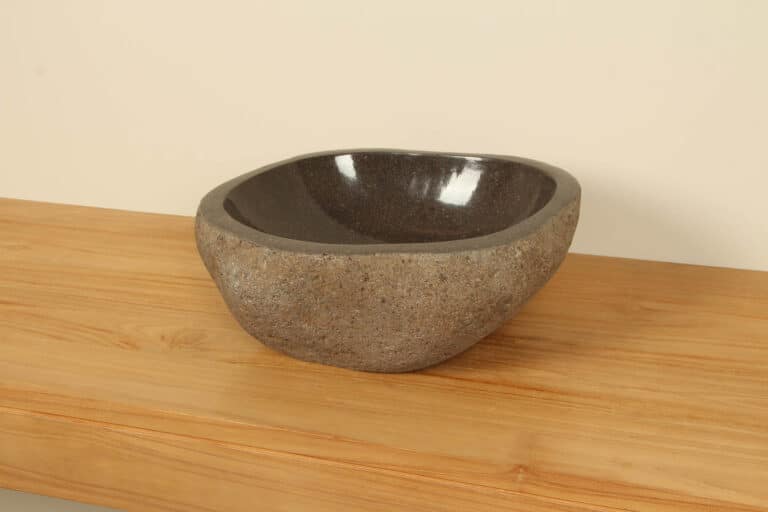 Middelgrote natuursteen waskom van Riviersteen. Deze rivierstenen waskom van is perfect voor kleine tot middelgrote badkamermeubels. Elke rivierstenen waskom wordt met de hand vervaardigd uit massief natuursteen. De binnenzijde van de kom wordt glad gepolijst voor een snelle waterafvoer en eenvoudig onderhoud, de buitenzijde blijft ruw en onbewerkt waardoor de kom zijn robuuste en natuurlijke karakter behoudt.