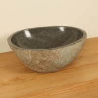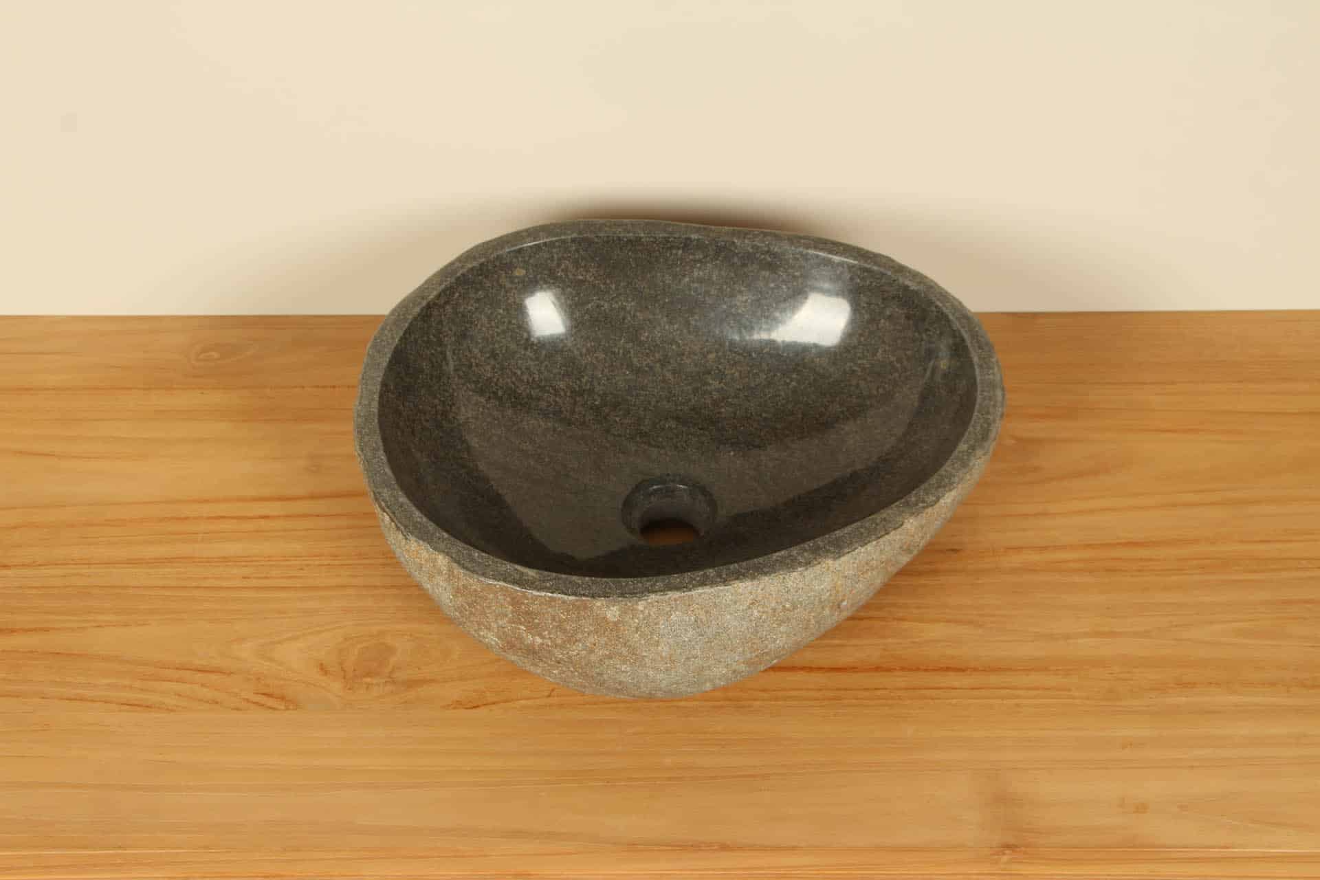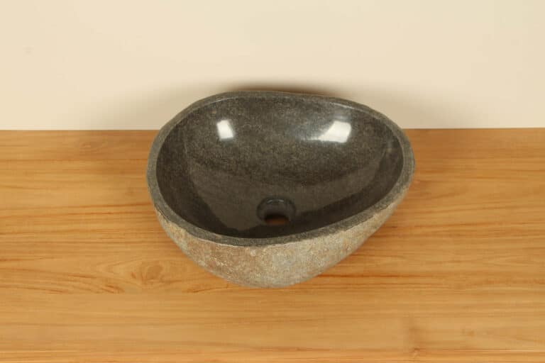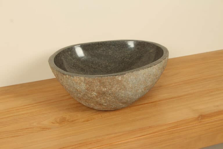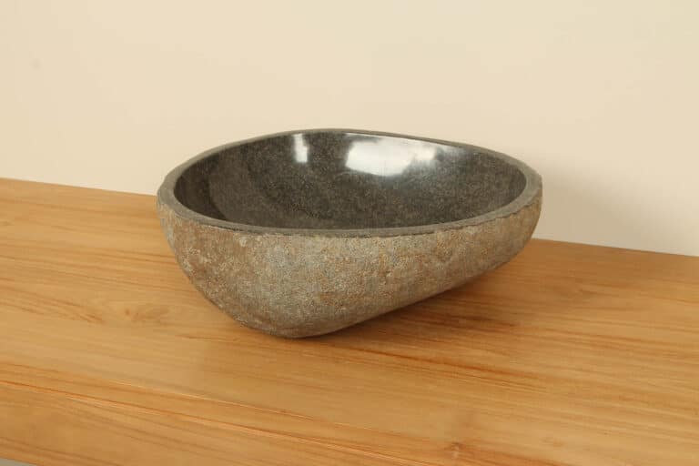 Middelgrote natuursteen waskom van Riviersteen. Deze rivierstenen waskom van is perfect voor kleine tot middelgrote badkamermeubels. Elke rivierstenen waskom wordt met de hand vervaardigd uit massief natuursteen. De binnenzijde van de kom wordt glad gepolijst voor een snelle waterafvoer en eenvoudig onderhoud, de buitenzijde blijft ruw en onbewerkt waardoor de kom zijn robuuste en natuurlijke karakter behoudt.
