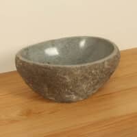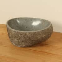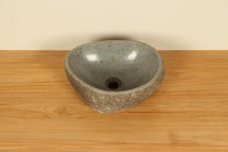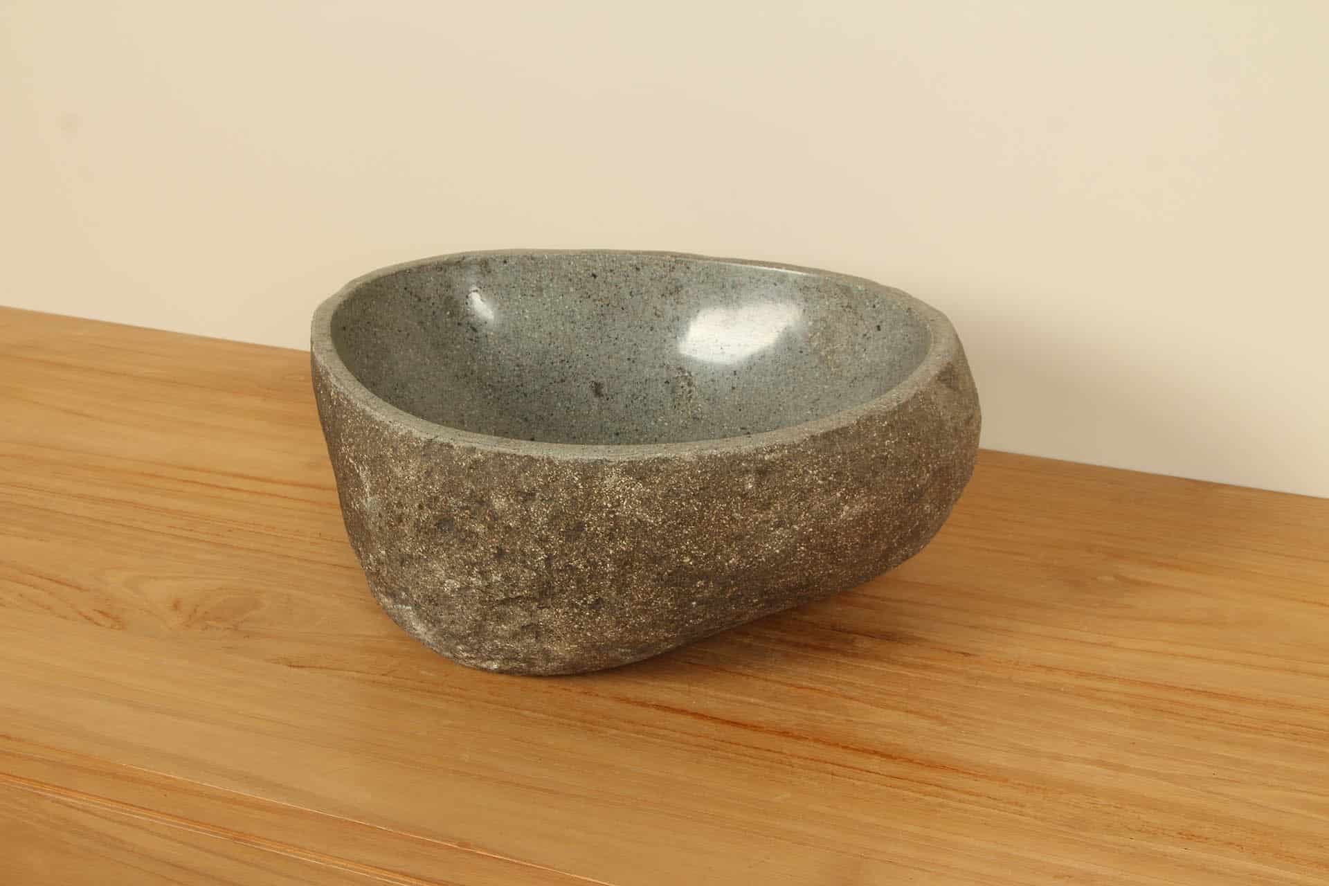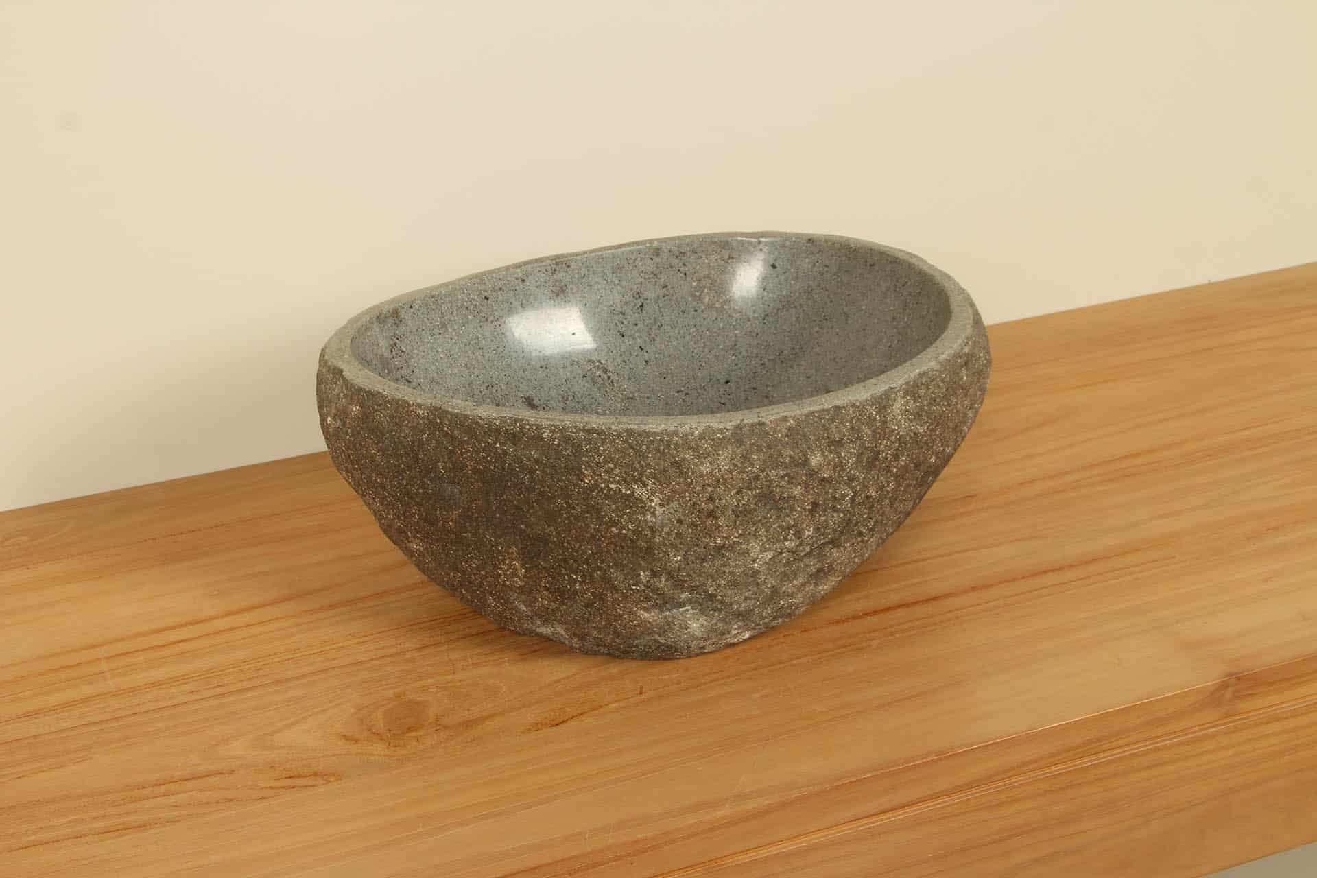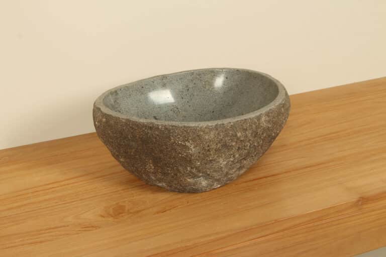 Middelgrote natuursteen waskom van Riviersteen. Deze rivierstenen waskom van is perfect voor kleine tot middelgrote badkamermeubels. Elke rivierstenen waskom wordt met de hand vervaardigd uit massief natuursteen. De binnenzijde van de kom wordt glad gepolijst voor een snelle waterafvoer en eenvoudig onderhoud, de buitenzijde blijft ruw en onbewerkt waardoor de kom zijn robuuste en natuurlijke karakter behoudt.