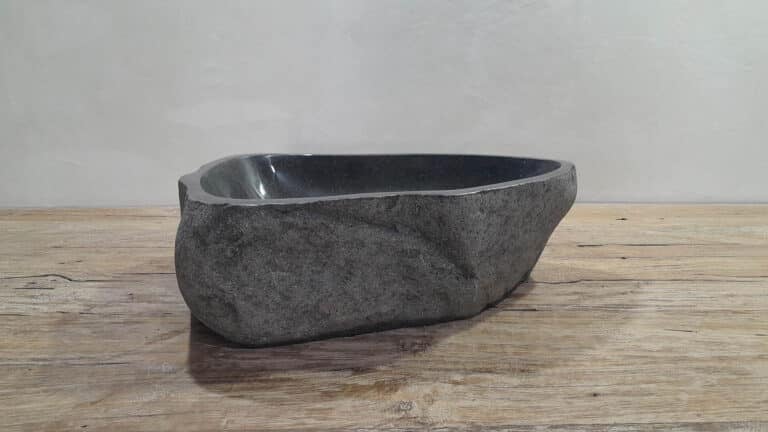 Middelgrote natuursteen waskom van Riviersteen. Deze rivierstenen waskom van is perfect voor kleine tot middelgrote badkamermeubels. Elke rivierstenen waskom wordt met de hand vervaardigd uit massief natuursteen. De binnenzijde van de kom wordt glad gepolijst voor een snelle waterafvoer en eenvoudig onderhoud, de buitenzijde blijft ruw en onbewerkt waardoor de kom zijn robuuste en natuurlijke karakter behoudt.