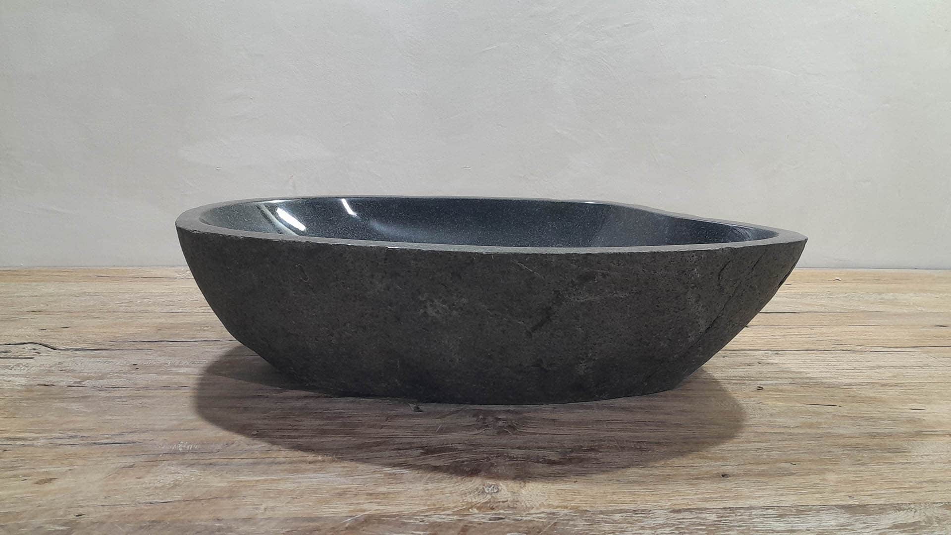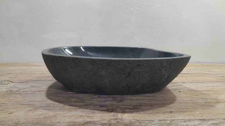 Middelgrote natuursteen waskom van Riviersteen. Deze rivierstenen waskom van is perfect voor kleine tot middelgrote badkamermeubels. Elke rivierstenen waskom wordt met de hand vervaardigd uit massief natuursteen. De binnenzijde van de kom wordt glad gepolijst voor een snelle waterafvoer en eenvoudig onderhoud, de buitenzijde blijft ruw en onbewerkt waardoor de kom zijn robuuste en natuurlijke karakter behoudt.