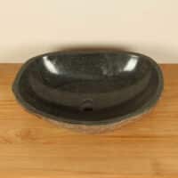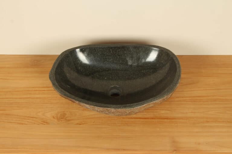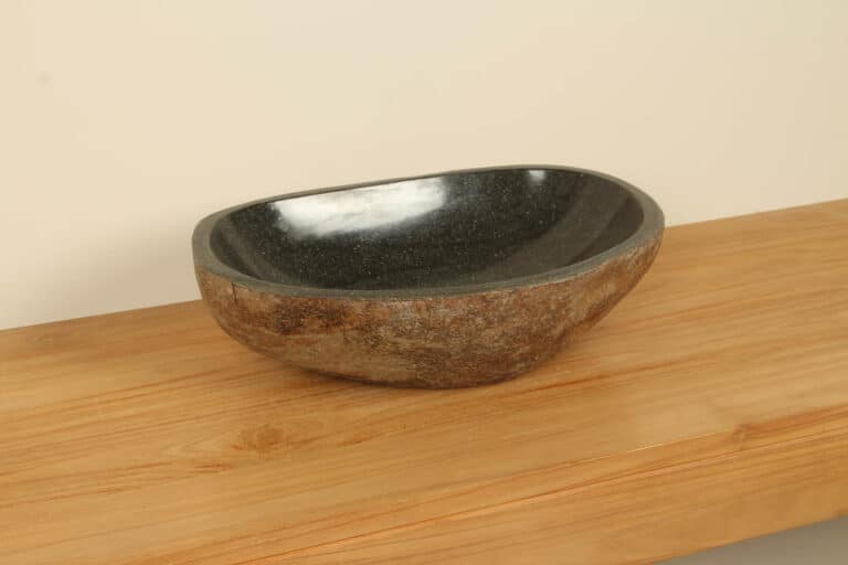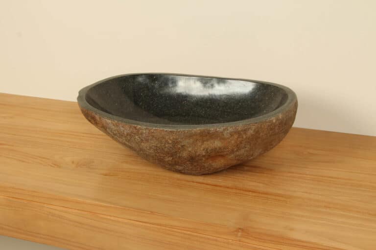 Middelgrote natuursteen waskom van Riviersteen. Deze rivierstenen waskom van is perfect voor kleine tot middelgrote badkamermeubels. Elke rivierstenen waskom wordt met de hand vervaardigd uit massief natuursteen. De binnenzijde van de kom wordt glad gepolijst voor een snelle waterafvoer en eenvoudig onderhoud, de buitenzijde blijft ruw en onbewerkt waardoor de kom zijn robuuste en natuurlijke karakter behoudt.