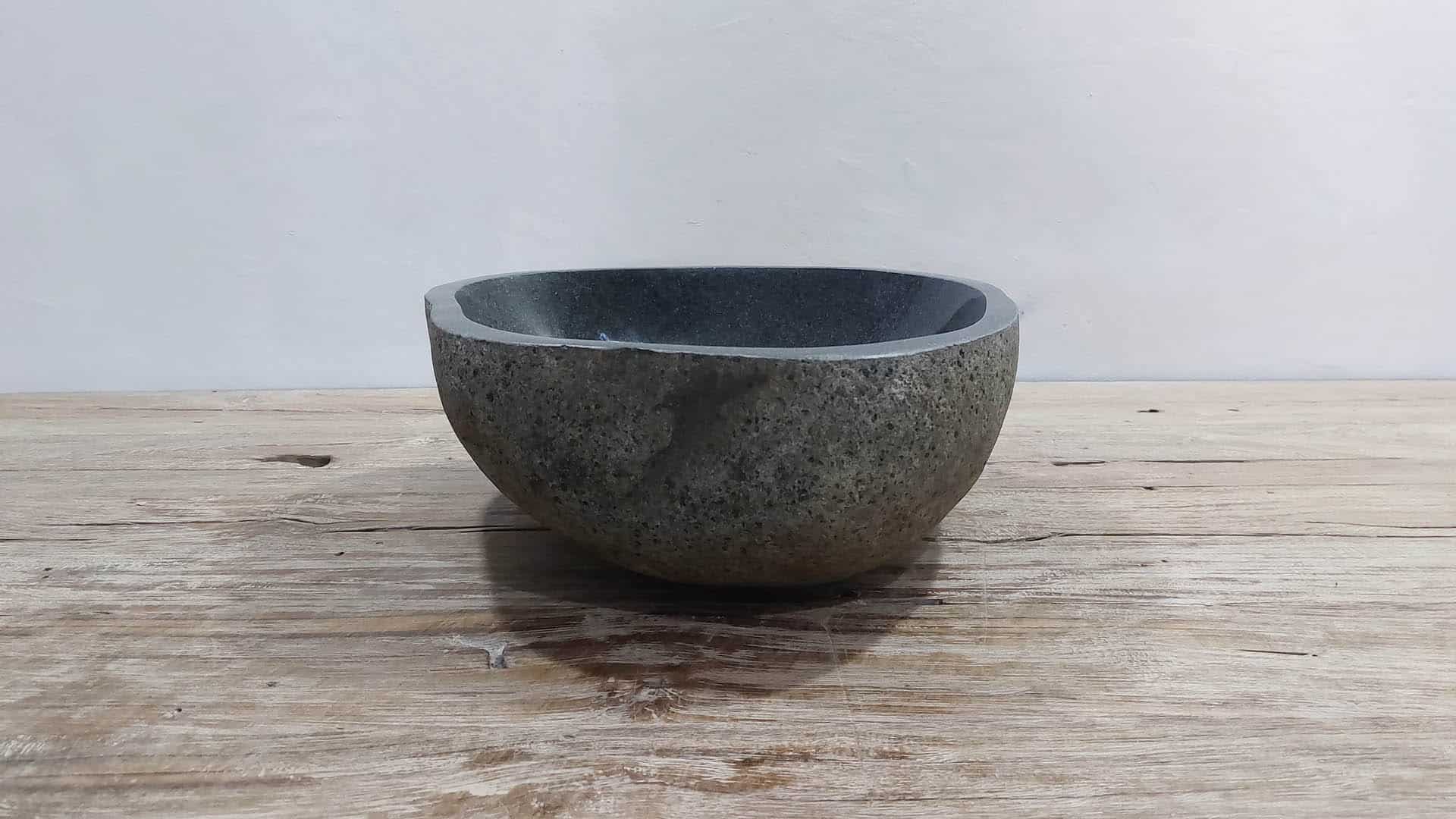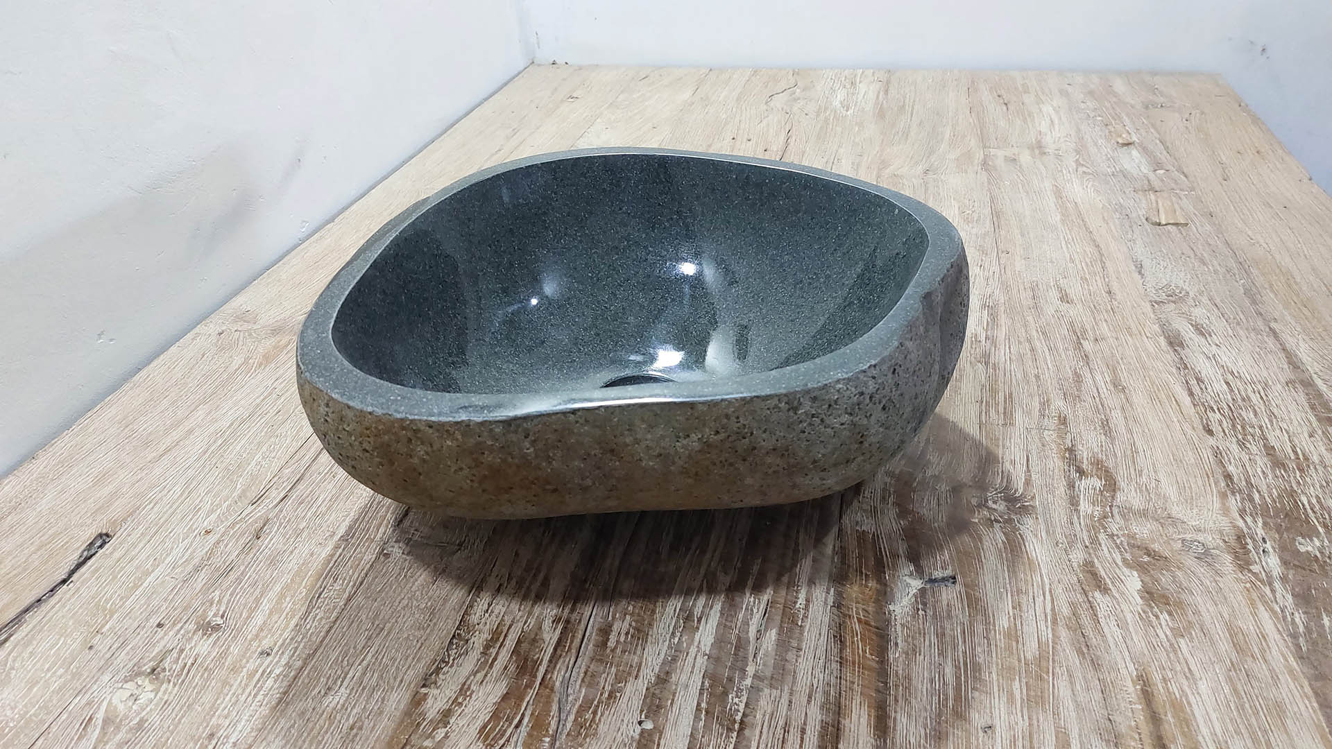 Middelgrote natuursteen waskom van Riviersteen. Deze rivierstenen waskom van is perfect voor kleine tot middelgrote badkamermeubels. Elke rivierstenen waskom wordt met de hand vervaardigd uit massief natuursteen. De binnenzijde van de kom wordt glad gepolijst voor een snelle waterafvoer en eenvoudig onderhoud, de buitenzijde blijft ruw en onbewerkt waardoor de kom zijn robuuste en natuurlijke karakter behoudt.
