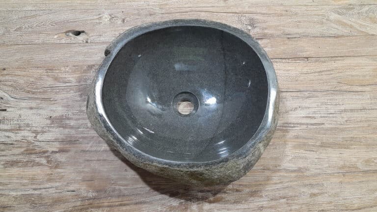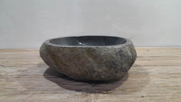 Middelgrote natuursteen waskom van Riviersteen. Deze rivierstenen waskom van is perfect voor kleine tot middelgrote badkamermeubels. Elke rivierstenen waskom wordt met de hand vervaardigd uit massief natuursteen. De binnenzijde van de kom wordt glad gepolijst voor een snelle waterafvoer en eenvoudig onderhoud, de buitenzijde blijft ruw en onbewerkt waardoor de kom zijn robuuste en natuurlijke karakter behoudt.