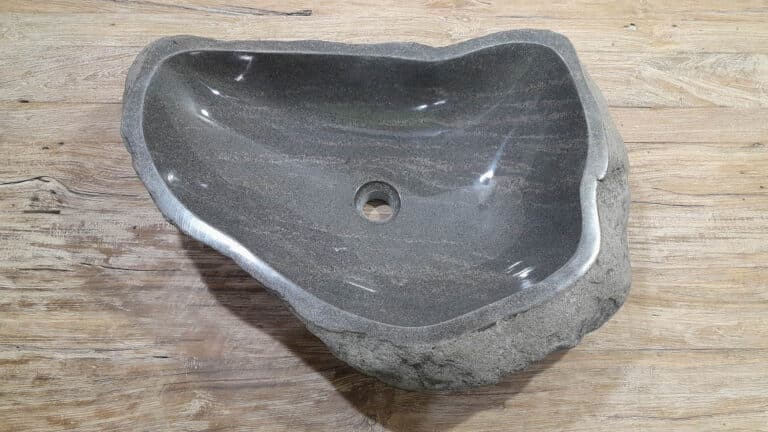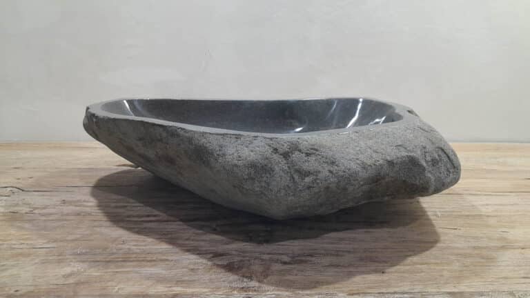 Middelgrote natuursteen waskom van Riviersteen. Deze rivierstenen waskom van is perfect voor kleine tot middelgrote badkamermeubels. Elke rivierstenen waskom wordt met de hand vervaardigd uit massief natuursteen. De binnenzijde van de kom wordt glad gepolijst voor een snelle waterafvoer en eenvoudig onderhoud, de buitenzijde blijft ruw en onbewerkt waardoor de kom zijn robuuste en natuurlijke karakter behoudt.