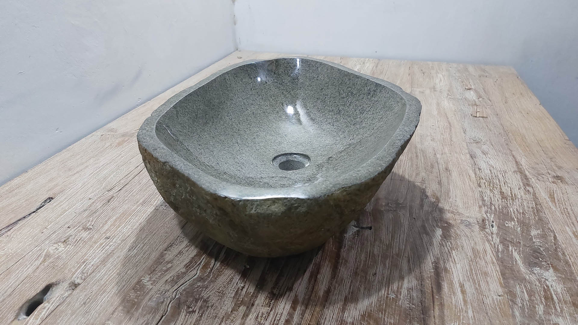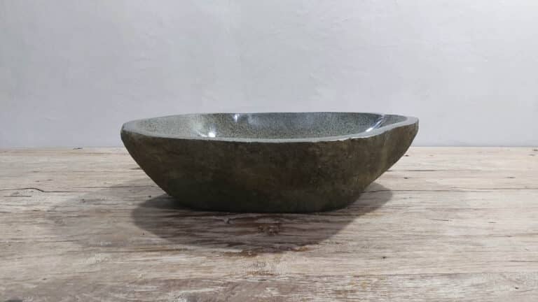 Middelgrote natuursteen waskom van Riviersteen. Deze rivierstenen waskom van is perfect voor kleine tot middelgrote badkamermeubels. Elke rivierstenen waskom wordt met de hand vervaardigd uit massief natuursteen. De binnenzijde van de kom wordt glad gepolijst voor een snelle waterafvoer en eenvoudig onderhoud, de buitenzijde blijft ruw en onbewerkt waardoor de kom zijn robuuste en natuurlijke karakter behoudt.