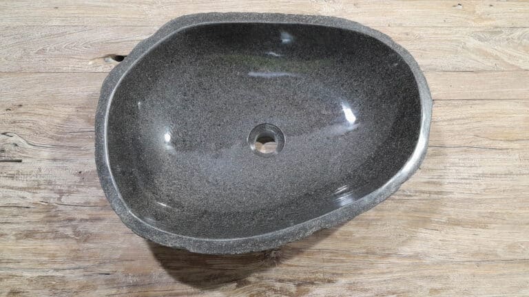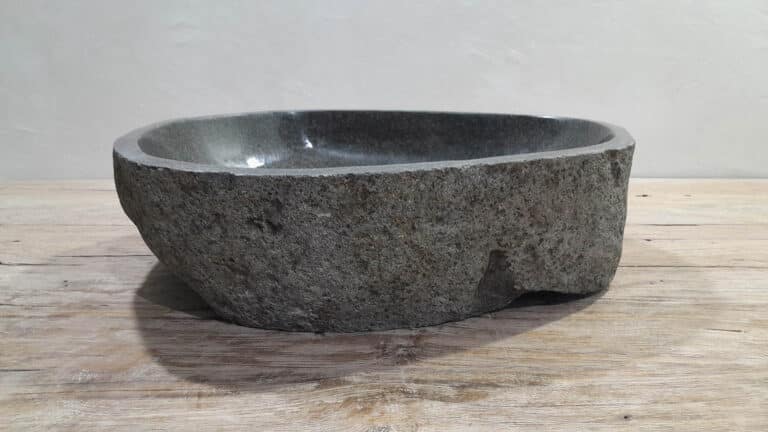 Middelgrote natuursteen waskom van Riviersteen. Deze rivierstenen waskom van is perfect voor kleine tot middelgrote badkamermeubels. Elke rivierstenen waskom wordt met de hand vervaardigd uit massief natuursteen. De binnenzijde van de kom wordt glad gepolijst voor een snelle waterafvoer en eenvoudig onderhoud, de buitenzijde blijft ruw en onbewerkt waardoor de kom zijn robuuste en natuurlijke karakter behoudt.