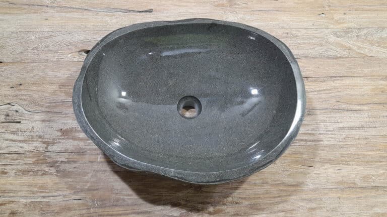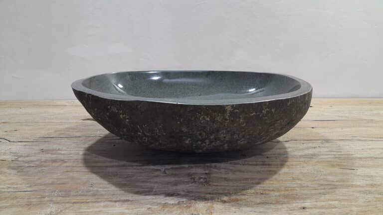 Middelgrote natuursteen waskom van Riviersteen. Deze rivierstenen waskom van is perfect voor kleine tot middelgrote badkamermeubels. Elke rivierstenen waskom wordt met de hand vervaardigd uit massief natuursteen. De binnenzijde van de kom wordt glad gepolijst voor een snelle waterafvoer en eenvoudig onderhoud, de buitenzijde blijft ruw en onbewerkt waardoor de kom zijn robuuste en natuurlijke karakter behoudt.