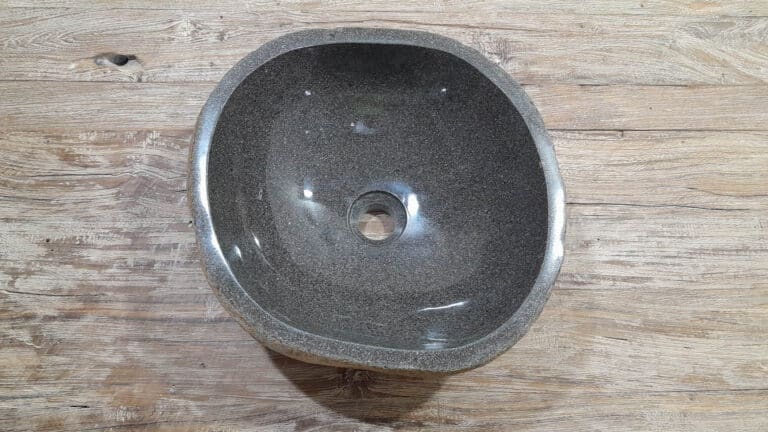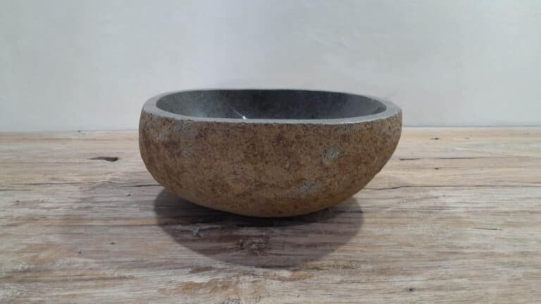 Middelgrote natuursteen waskom van Riviersteen. Deze rivierstenen waskom van is perfect voor kleine tot middelgrote badkamermeubels. Elke rivierstenen waskom wordt met de hand vervaardigd uit massief natuursteen. De binnenzijde van de kom wordt glad gepolijst voor een snelle waterafvoer en eenvoudig onderhoud, de buitenzijde blijft ruw en onbewerkt waardoor de kom zijn robuuste en natuurlijke karakter behoudt.
