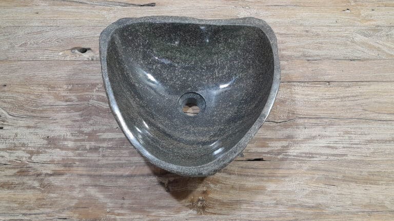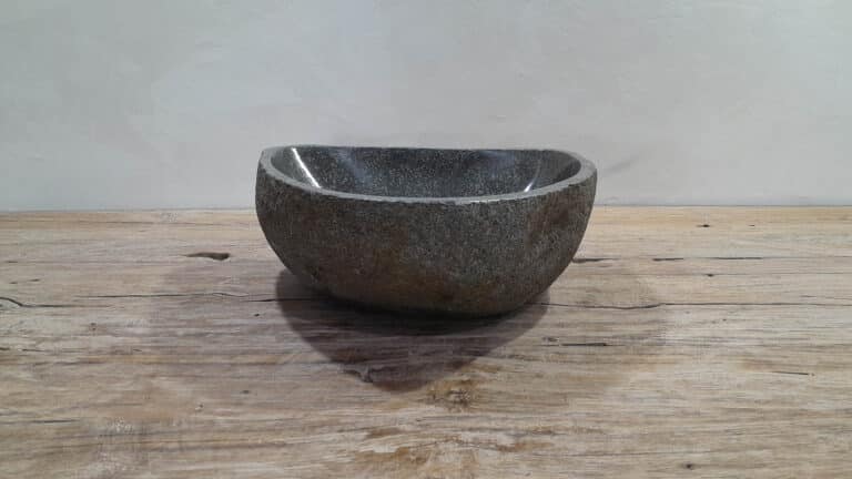 Middelgrote natuursteen waskom van Riviersteen. Deze rivierstenen waskom van is perfect voor kleine tot middelgrote badkamermeubels. Elke rivierstenen waskom wordt met de hand vervaardigd uit massief natuursteen. De binnenzijde van de kom wordt glad gepolijst voor een snelle waterafvoer en eenvoudig onderhoud, de buitenzijde blijft ruw en onbewerkt waardoor de kom zijn robuuste en natuurlijke karakter behoudt.