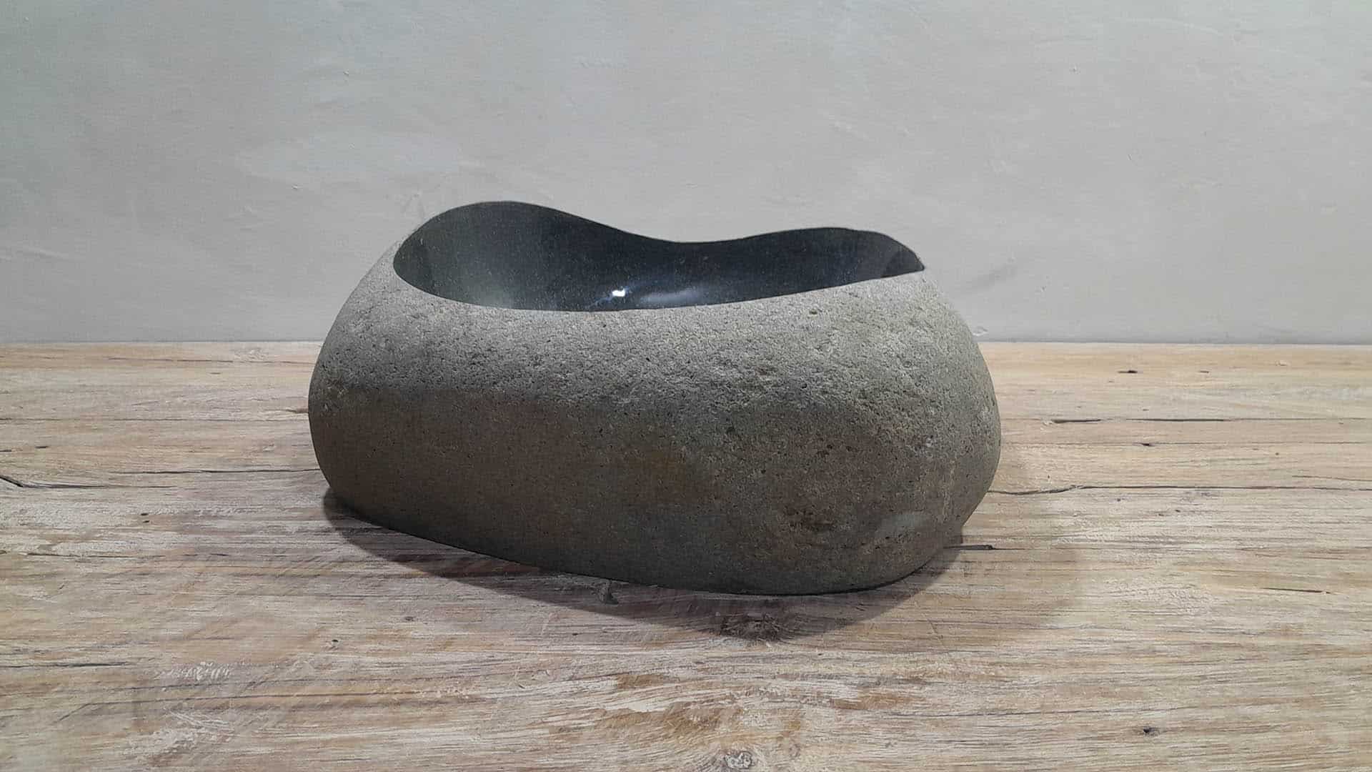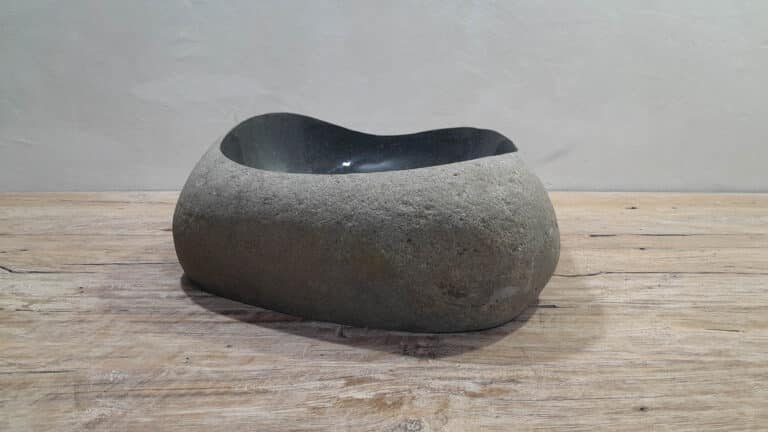 Middelgrote natuursteen waskom van Riviersteen. Deze rivierstenen waskom van is perfect voor kleine tot middelgrote badkamermeubels. Elke rivierstenen waskom wordt met de hand vervaardigd uit massief natuursteen. De binnenzijde van de kom wordt glad gepolijst voor een snelle waterafvoer en eenvoudig onderhoud, de buitenzijde blijft ruw en onbewerkt waardoor de kom zijn robuuste en natuurlijke karakter behoudt.
