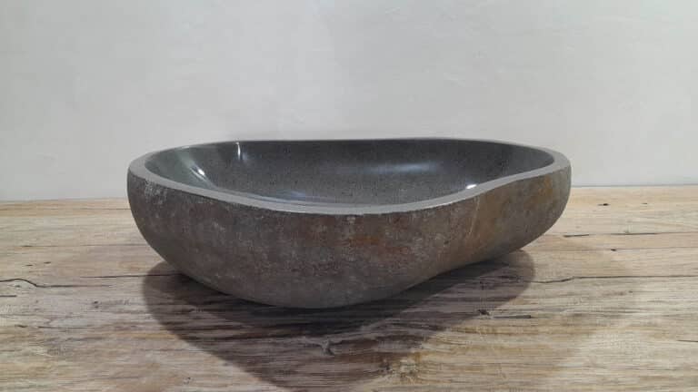 Middelgrote natuursteen waskom van Riviersteen. Deze rivierstenen waskom van is perfect voor kleine tot middelgrote badkamermeubels. Elke rivierstenen waskom wordt met de hand vervaardigd uit massief natuursteen. De binnenzijde van de kom wordt glad gepolijst voor een snelle waterafvoer en eenvoudig onderhoud, de buitenzijde blijft ruw en onbewerkt waardoor de kom zijn robuuste en natuurlijke karakter behoudt.