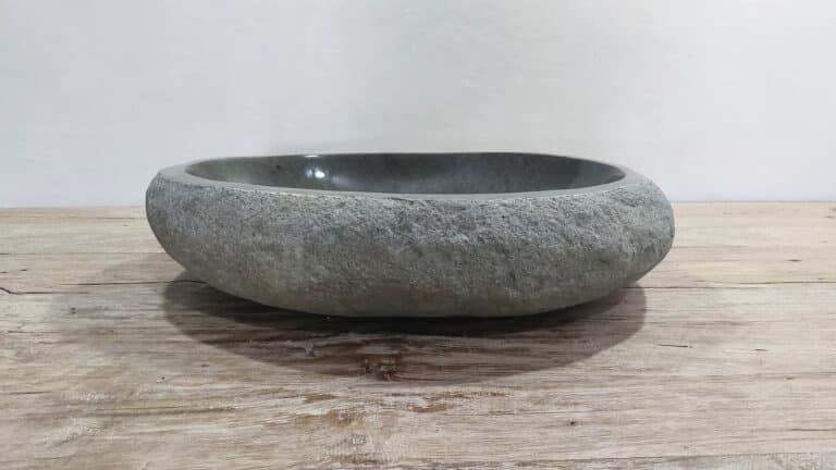 Middelgrote natuursteen waskom van Riviersteen. Deze rivierstenen waskom van is perfect voor kleine tot middelgrote badkamermeubels. Elke rivierstenen waskom wordt met de hand vervaardigd uit massief natuursteen. De binnenzijde van de kom wordt glad gepolijst voor een snelle waterafvoer en eenvoudig onderhoud, de buitenzijde blijft ruw en onbewerkt waardoor de kom zijn robuuste en natuurlijke karakter behoudt.