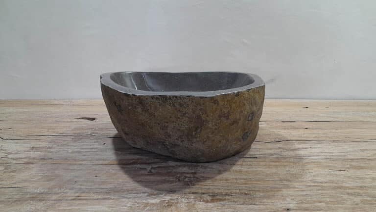 Middelgrote natuursteen waskom van Riviersteen. Deze rivierstenen waskom van is perfect voor kleine tot middelgrote badkamermeubels. Elke rivierstenen waskom wordt met de hand vervaardigd uit massief natuursteen. De binnenzijde van de kom wordt glad gepolijst voor een snelle waterafvoer en eenvoudig onderhoud, de buitenzijde blijft ruw en onbewerkt waardoor de kom zijn robuuste en natuurlijke karakter behoudt.