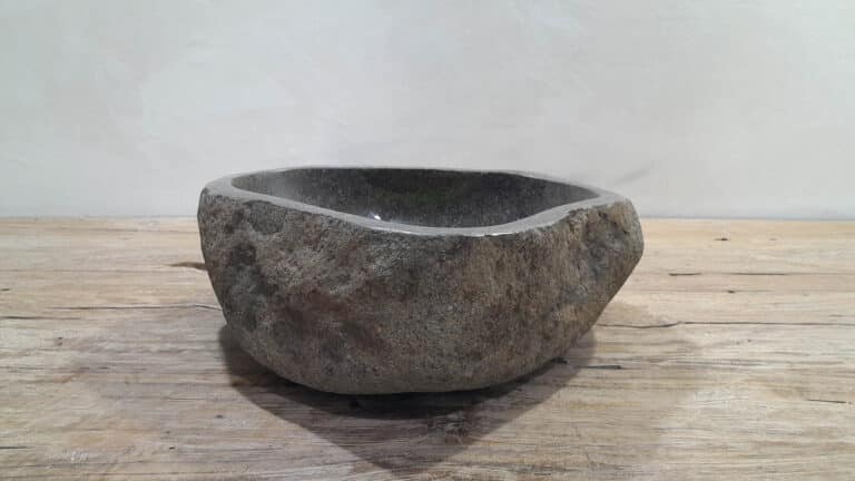 Middelgrote natuursteen waskom van Riviersteen. Deze rivierstenen waskom van is perfect voor kleine tot middelgrote badkamermeubels. Elke rivierstenen waskom wordt met de hand vervaardigd uit massief natuursteen. De binnenzijde van de kom wordt glad gepolijst voor een snelle waterafvoer en eenvoudig onderhoud, de buitenzijde blijft ruw en onbewerkt waardoor de kom zijn robuuste en natuurlijke karakter behoudt.