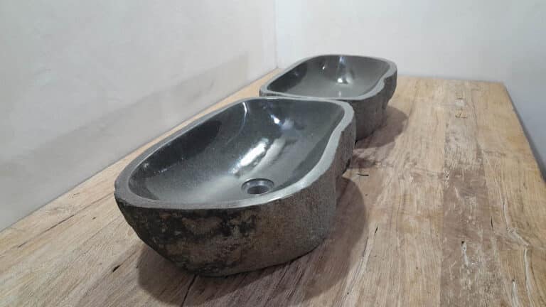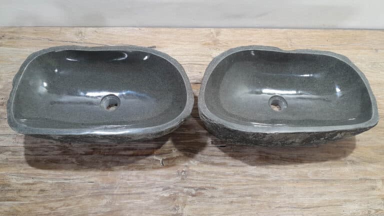 Met deze riviersteen waskom set haal je een bijzonder natuurproduct in huis. Deze set bestaat uit twee handgemaakte waskommen, vervaardigd uit één riviersteen. Zo sluiten de kleur, het formaat en de tekening in de natuursteen waskom perfect op elkaar aan, terwijl beide kommen hun eigen natuurlijke variatie behouden. Ideaal voor een tweepersoons badkamermeubel.