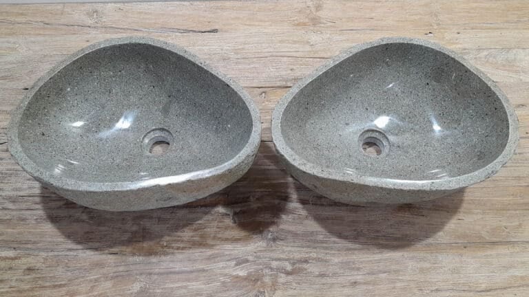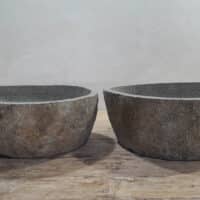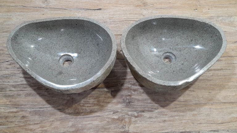 Met deze riviersteen waskom set haal je een bijzonder natuurproduct in huis. Deze set bestaat uit twee handgemaakte waskommen, vervaardigd uit één riviersteen. Zo sluiten de kleur, het formaat en de tekening in de natuursteen waskom perfect op elkaar aan, terwijl beide kommen hun eigen natuurlijke variatie behouden. Ideaal voor een tweepersoons badkamermeubel.