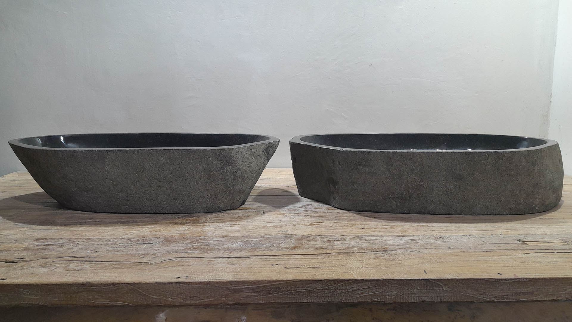 Elke set wordt volledig met de hand gemaakt uit massief natuursteen. De binnenzijde is glad gepolijst voor optimale waterafvoer en eenvoudig onderhoud, terwijl de buitenzijde ruw blijft en het stoere, natuurlijke karakter behoudt.