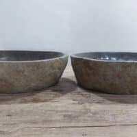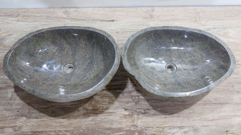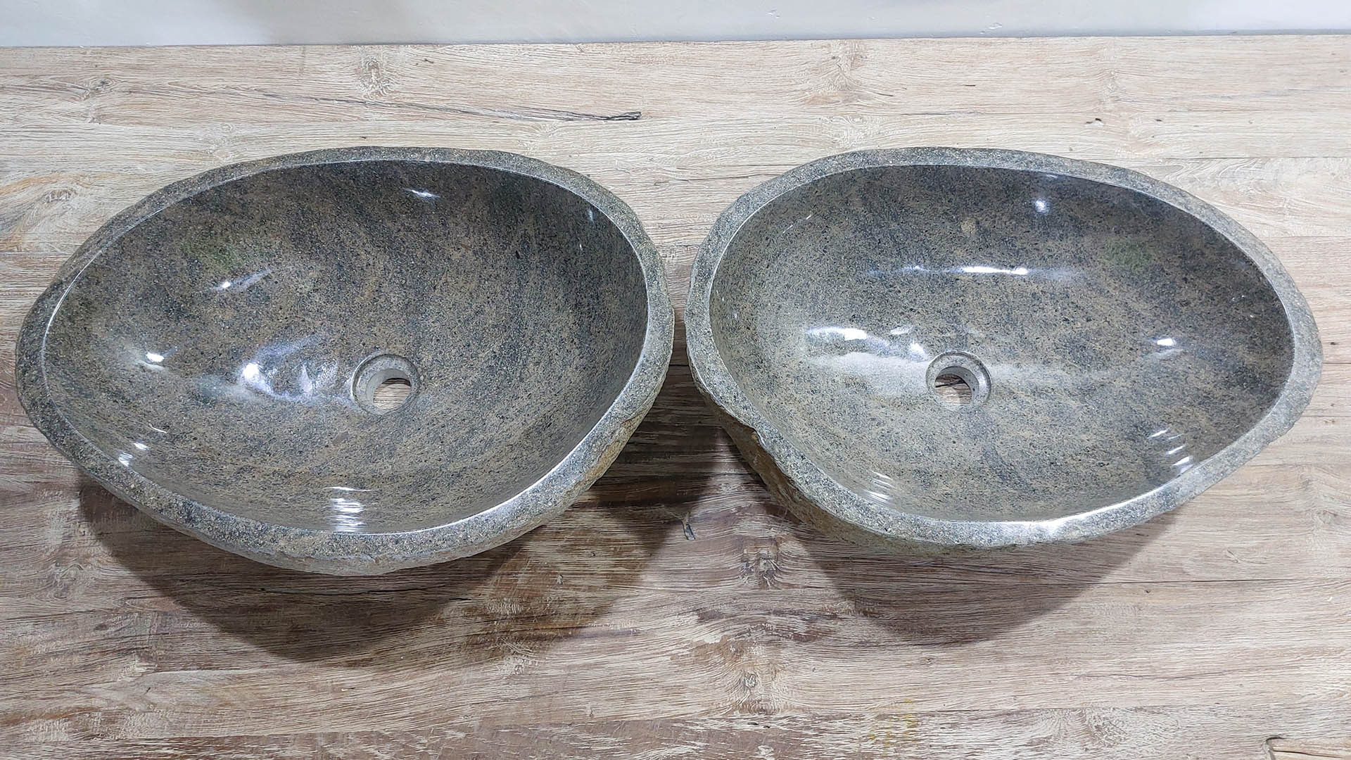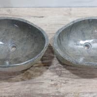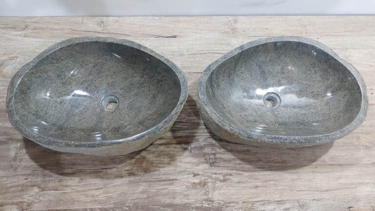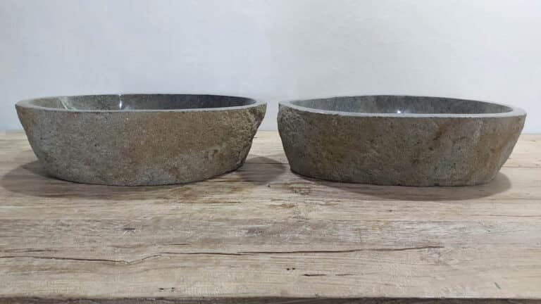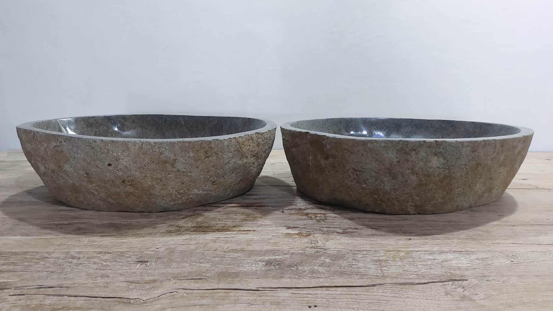 Met deze riviersteen waskom set haal je een bijzonder natuurproduct in huis. Deze set bestaat uit twee handgemaakte waskommen, vervaardigd uit één riviersteen. Zo sluiten de kleur, het formaat en de tekening in de natuursteen waskom perfect op elkaar aan, terwijl beide kommen hun eigen natuurlijke variatie behouden. Ideaal voor een tweepersoons badkamermeubel.