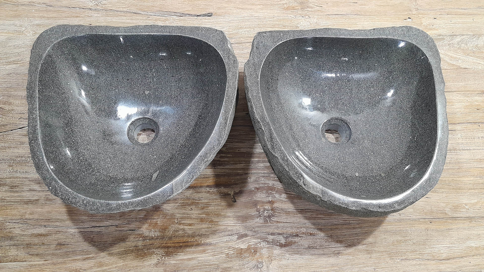 Elke set wordt volledig met de hand gemaakt uit massief natuursteen. De binnenzijde is glad gepolijst voor optimale waterafvoer en eenvoudig onderhoud, terwijl de buitenzijde ruw blijft en het stoere, natuurlijke karakter behoudt.