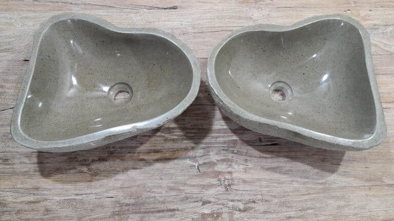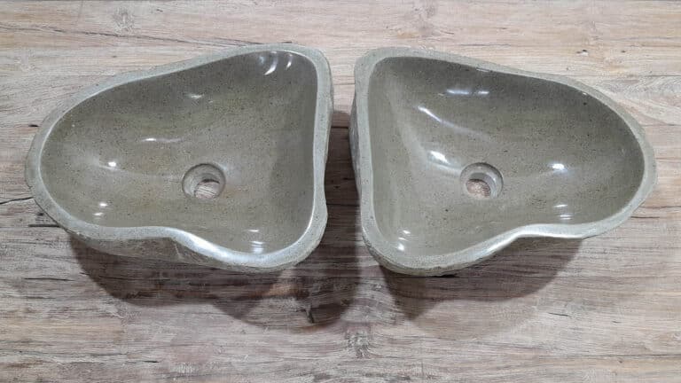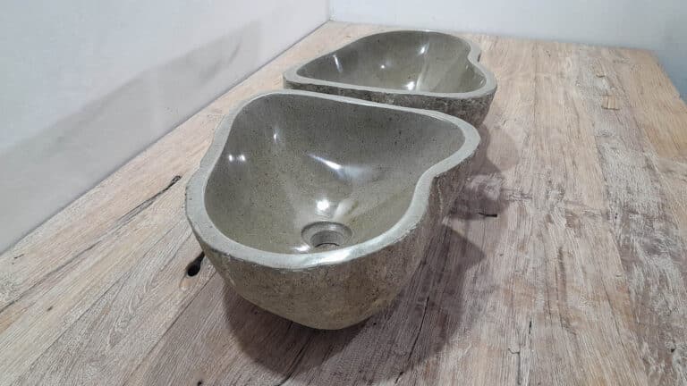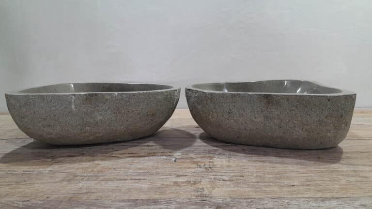 Met deze riviersteen waskom set haal je een bijzonder natuurproduct in huis. Deze set bestaat uit twee handgemaakte waskommen, vervaardigd uit één riviersteen. Zo sluiten de kleur, het formaat en de tekening in de natuursteen waskom perfect op elkaar aan, terwijl beide kommen hun eigen natuurlijke variatie behouden. Ideaal voor een tweepersoons badkamermeubel.