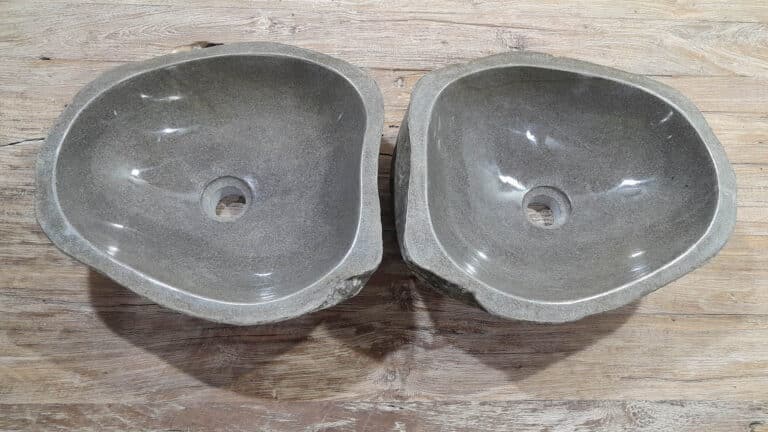 Met deze riviersteen waskom set haal je een bijzonder natuurproduct in huis. Deze set bestaat uit twee handgemaakte waskommen, vervaardigd uit één riviersteen. Zo sluiten de kleur, het formaat en de tekening in de natuursteen waskom perfect op elkaar aan, terwijl beide kommen hun eigen natuurlijke variatie behouden. Ideaal voor een tweepersoons badkamermeubel.