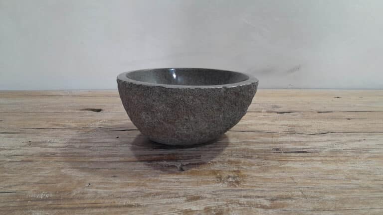Kleine natuursteen waskom van Riviersteen. Door het compacte formaat is deze kleine riviersteen waskom ideaal voor het toilet. Elke rivierstenen waskom wordt met de hand gemaakt uit massief natuursteen. De binnenzijde van de kom is gepolijst en buitenzijde blijft onbewerkt waardoor de waskom altijd een unieke robuuste uitstraling heeft.